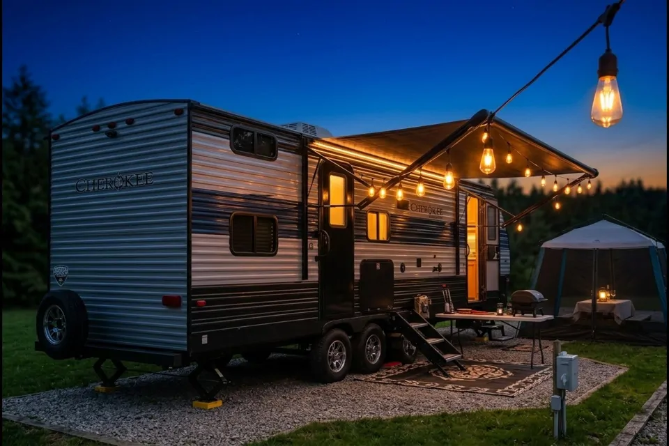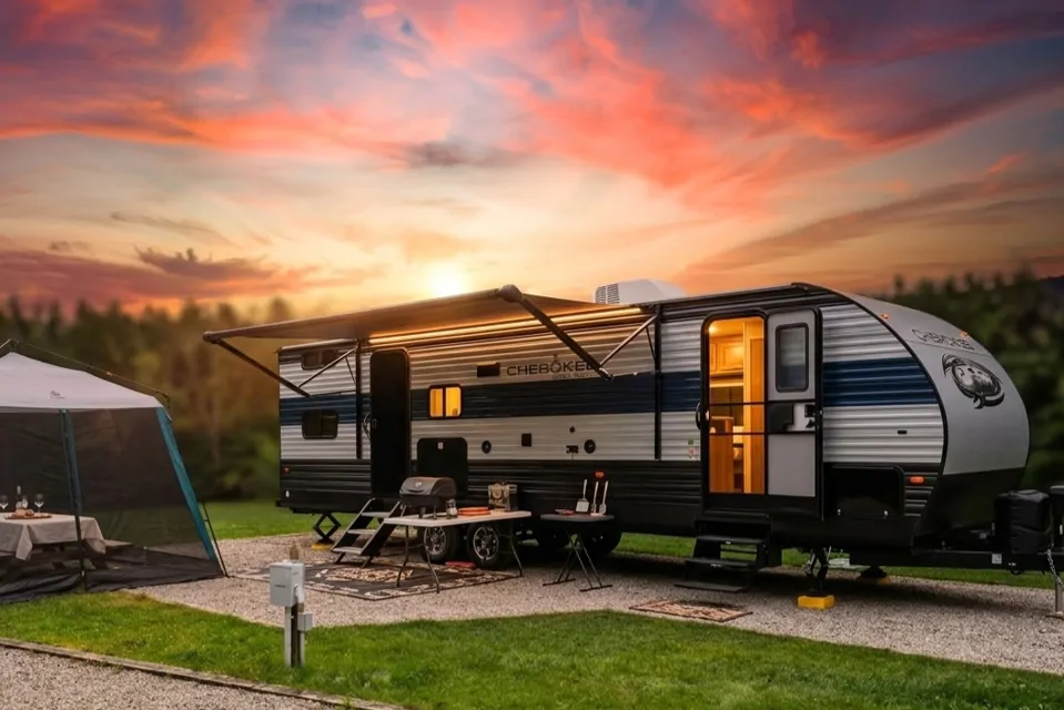 Comfort Setup: Includes a large power awning, high-quality outdoor carpets, and 10x10 tents to give you extra shaded space at your site.