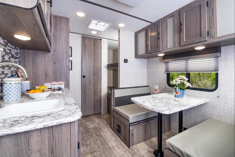 Inside, you’ll find a bright, well-designed layout that comfortably sleeps up to 5 people. There's a cozy queen bed, double bunk beds, and a convertible dinette that transforms into an additional sleeping space. Enjoy the convenience of a fully-equipped kitchen with a fridge, two-burner stove, microwave, and sink – everything you need to whip up a meal after a day of hiking, biking, or lounging by the lake.