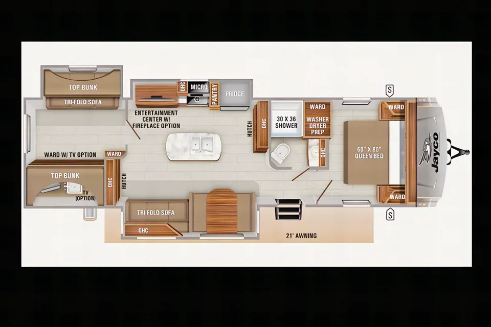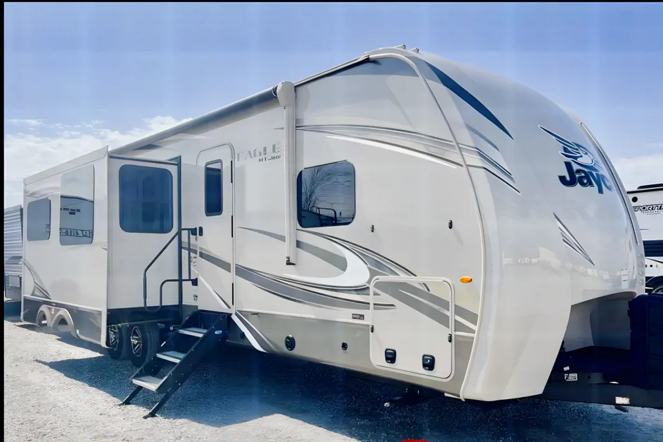 Amazing Spacious trailer. Real luxury while camping, with a beautiful kitchen featuring a convenient island, double door fridge, stove, oven, microwave, outside kitchen with grill, mini fridge and sink, bunk, confortable Serta King bed, full bathroom, 2 couches that turn into queen beds, dinning, 3 tvs, massive led lid awning, big storage compartment, Bluetooth connected speakers inside and outside and more! Kitchen utensils, dishes and cups, Keurig coffee maker, rice cooker, toaster, kettle, fireplace. Sanitized bedding. All you need for your comfort is available here!