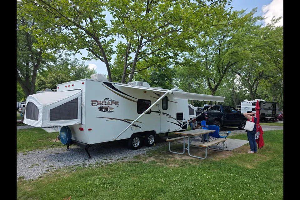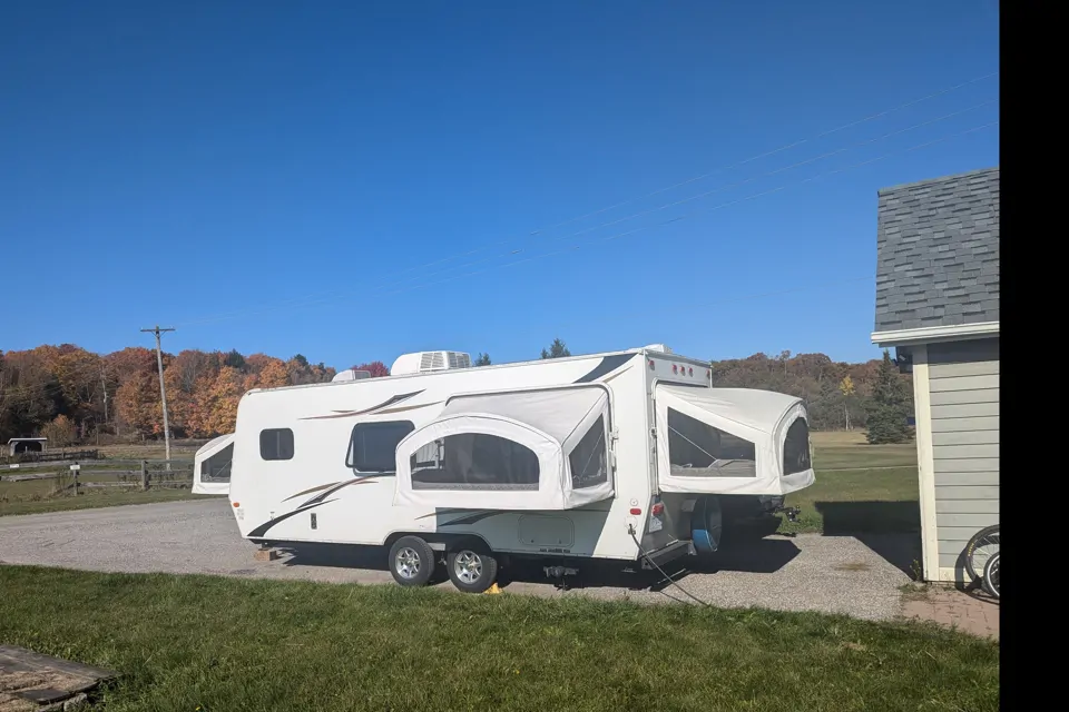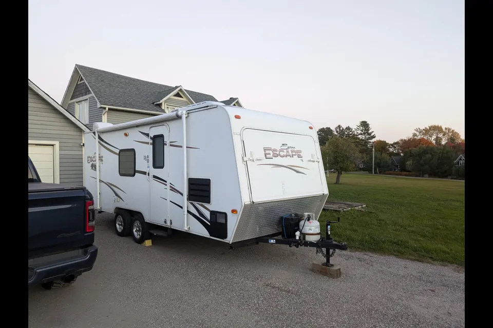 Our Spree Escape E21FKT is in great condition and its being under a roof during winters or with a camper cover. It's a lightweight travel trailer known for its spacious interior and abundant features. It offers a good balance of comfort and functionality. Perfect for a small family but can sleep more than 8 people. Super spacious inside and have everything that you need. A/C, water heater, fridge/freezer, microwave, full shower, furnace, heavy duty battery box with usb ports and pre-inlets for solar panel or blanket etc. We also can offer keurig coffe machine water boiler for tea utensils etc. All that you need to have a great trip.