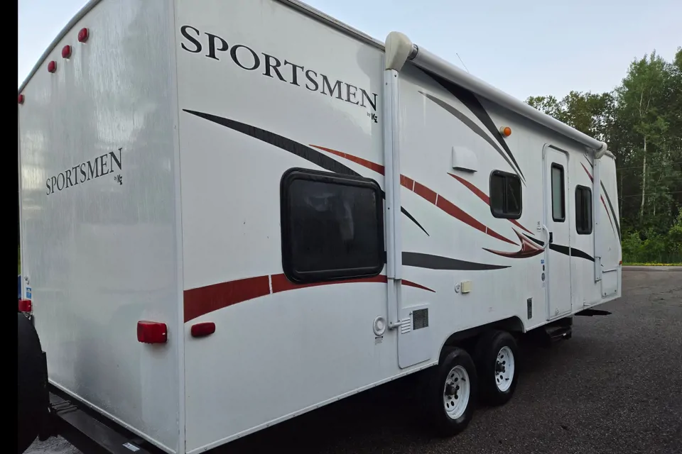 Inside you have a queen bed with storage above, plus a 2 wardrobe, 5 person dinette with storage under the seats table drops down to create another sleeping space. This would be recommended for a shorter adult or younger children, single over a oversized, twin bunk over 6' long, a pantry, 2 piece bath and the kitchen with Fridge, separate freezer, 3 burner cooktop and sink.