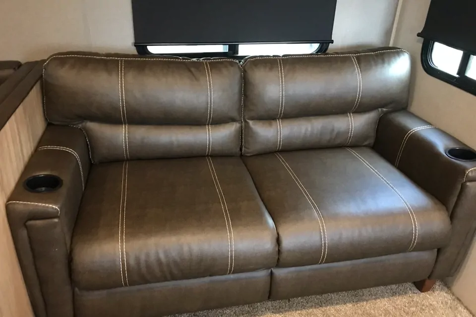 Our trailer has all the comforts of home, including heat, air conditioning, electric fireplace, bathroom (with a tub and shower), a kitchen with stove / oven, fridge and microwave, and an additional outdoor kitchen. There are two separate sleeping areas - a master with a queen size bed and the bunk room at the opposite end with 3 bunks. Both sleeping areas have ample storage. The sofa also opens up to make a comfortable double bed.