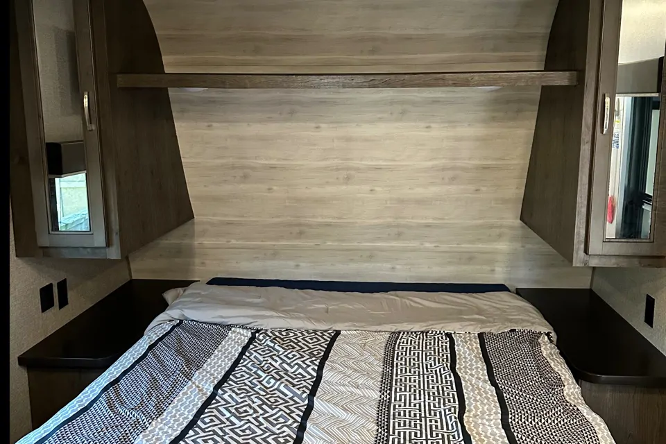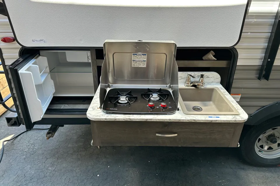 This family friendly trailer is amazing for your getaways. The bunk beds are amazing and could fit 2 adults comfortably on both top and bottom (not recommended for the top bunk due to weight limit of 300lbs). The outside shower is great to wash kids off after a day at the beach. The outside kitchen makes meal time a breeze.