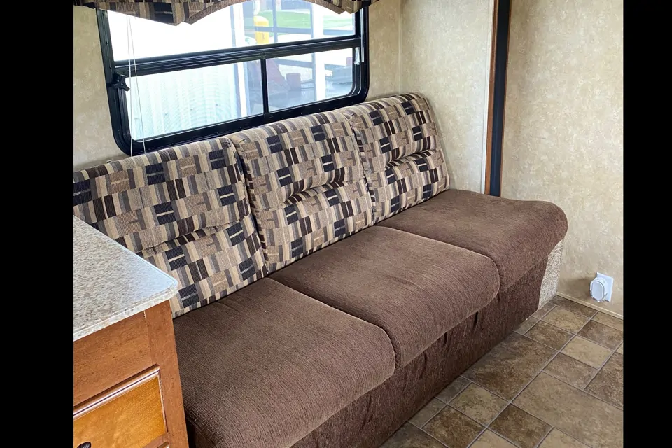 Double and single bunk beds at the rear. Dropdown table and pull out couch.