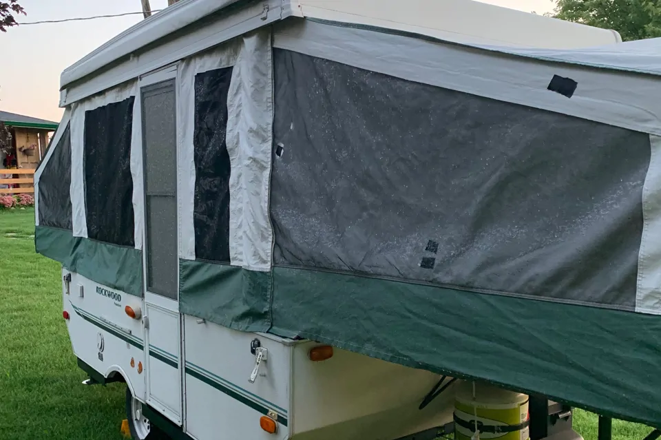 This trailer has had a couple patches over the years but I can guarantee you that it is watertight. It's a nice light weight trailer that you can pull behind a small vehicle. The electronic start propane furnace is nice in those colder months you just flip the thermostat and you have heat. It comes equipped with some basic needs like camping chairs a pot a couple pans a toaster . there is also , Cups bowls plates and some utensils. Just in case you don't want to use propane for heat there is an electric heater in there as well. The fridge that is in it runs 3 different ways such as propane , 12 volt or normal 110 volt power supply . just in case u need extra storage there is a electric cooler you can plug outside for your cool drinks .