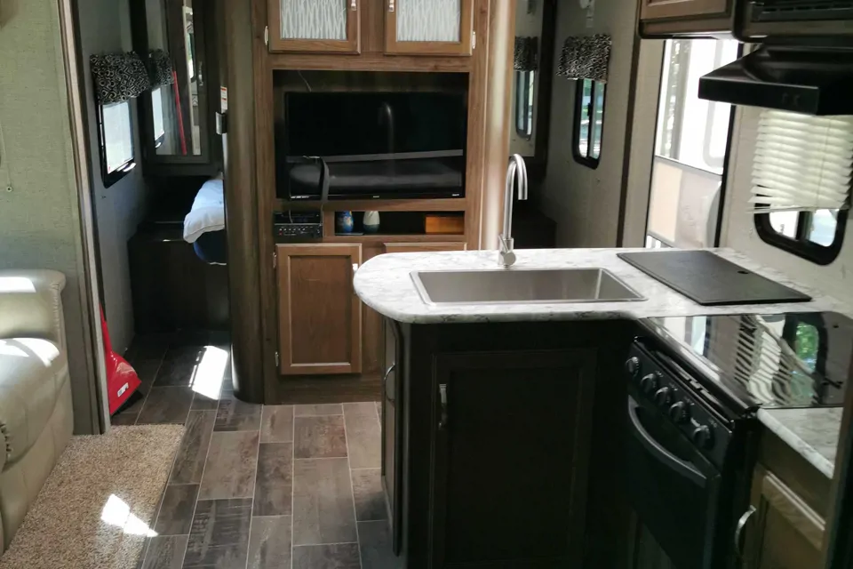 The trailer is outfitted with a TV , all your cutlery and plateware for your stay, an inside/outside radio.