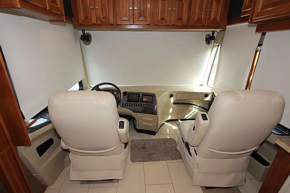 High end motorhome with heated floors, 1 full bathroom and 1 powder room. Fireplace, front and back air conditioning : 2 heating system, ( electric and propane): electric awning, self leveling jacks, king size bed in bedroom, pull out bed with air matress in matress, auto start generator, etc
