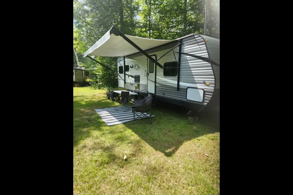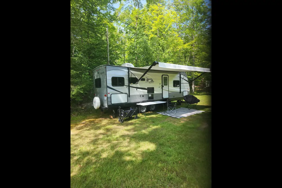 Only available at Woodland Campsite in Buckhorn Ontario. No pets allowed in campground. No jet skies allowed in campgroundThis trailer is not for rent outside of Woodland Campsite. 28 foot Jayco 245RL. Queen bed. Rear living slide out. Couch that goes to a bed. Dinette that goes to a bed. Ideal for a couple or couple with 2 small kids. Comes with everything you need