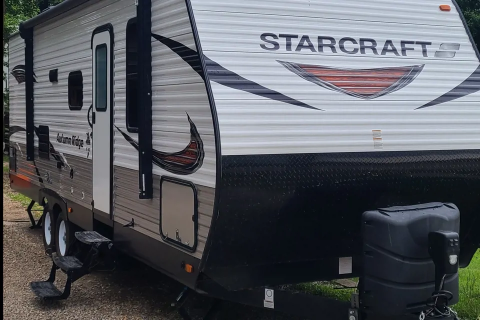 There are 2 propane tanks, 50 ft cord for plug in, 50ft black water hose and stabilizer bars for safe and easy towing. No matter where you go, this trailer is everything you need.