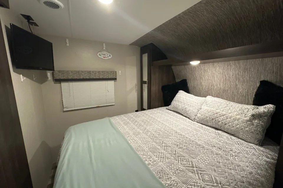 To the right of the main door, is the master bedroom, with a small tv, two closets and a queen size bed. This room also has a sliding door to minimize noise from the other areas of the camper.