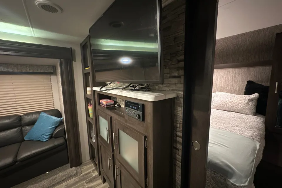 In the main area we have a large pop out which allows twice the floor space. There is a U shaped dinette that can transform into a bed that sleeps two (but if it’s adults it may be tight, one adult or two kids is probably best). There is also a couch that pulls out into a bed, but same thing as the table bed… it may be tight with two adults, unless you want to be comfy cozy. There is also an entertainment unit with a good size tv. The Tv has a fire stick and is easily connected if you hotspot data from your phone. The tv is also compatible with video game consoles such as a ps5, as long as you have the phone data to hotspot it.