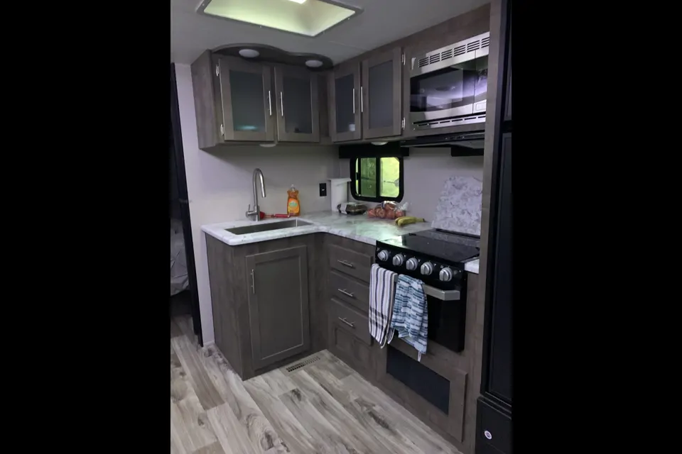Discover comfort on the road with our spacious 31- foot travel trailer! Perfect for families or adventure seekers, it features a large living area designed for relaxation and socializing. Enjoy a huge washroom that makes traveling feel like home, plus powerful air conditioning to keep you cool no matter the weather. Whether you’re exploring the great outdoors or just need a cozy getaway, this trailer offers convenience and comfort all in one. Easy to tow and fully equipped, it’s the ideal choice for your next adventure. Rent now and travel in style and ease!