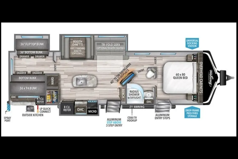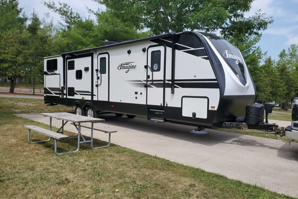 This 2021 Grand Design Imagine 3250 BH trailer has everything you will need to have a fantastic vacation. It's perfect for family getaways. It's huge 37ft length houses comfortable sleeping for 8 people (possibly 10 at most) while still offering a spacious living area packed with some awesome features. Always kept the perfect temperature with a 15000BTU AC and a 35000BTU Furnace (ready to roll whatever the season). The 21' power awning allows for lots of shade wherever you plan to camp with built in LED lighting to seamlessly take you into the evening. The outdoor kitchen has upper cupboard space and a slide out drawer with BBQ utensils included. A fridge and 2 gas burners are also built in to the outdoor space. The trailer is equipped with 2 20lb propane tanks to run the gas stoves and water heater but if you require more we can provide additional tanks for a small fee. There's a hose at the back corner for outdoor water access also. Inside the trailer has 3 bump outs giving you lots of indoor space in case of the inevitable rainy days. The kitchen has an 8 cu ft fridge/freezer, a microwave, a gas oven with 3 burners and an island with extra coutertop space and sink. Tonnes of storage cupboards and drawers and a pantry with a sliding barn door. The table has seating for 4 and can be converted into a bed for 2, or more if everyone gets cozy. The comfortable recliners are equipped with LED lighting, heated seats, cup holders and a massage feature. A working LED fireplace sits under the TV which has satellite, DVD, USB and CD capabilities. With both indoor and outdoor speakers you won't have to bring a radio for tunes. The bunk house in the back has 4 bunkbeds and lots of cupboard and drawer space for each person's belongings. USB ports in the walls make for easy charging for your tech and a door which separates it from the living space for privacy. The other end of the trailer has the queen bed with more cupboard space, USB chargers with cubbies on either side and individual lights. The bathroom has a sink, toilet and radius shower with a skylight and built in shelves. The trailer has 2 Grey water compartments which is great for getting further in between having to dump them. Inside the trailer, the control board monitors when the tanks are getting full so your always in the know. This trailer is kept immaculately clean with a professional cleaning between rentals. All kitchenware is included in your rental (Pots, Pans, Kettle, Keurig, Toaster, Dishes, Utensils...), only thing you will need is your groceries. Linens can be provided upon request. A generator is also available for rent if the site does not have power. Please feel free to contact me with any other requests or questions and I will be happy to discuss it with you. Thanks for checking out our trailer.