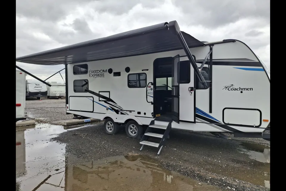 Enjoy all your outdoor adventures in this lightweight Coachmen Freedom Express. Features front walk-around queen bed, deep slide-out room with U-shaped dinette, double-over-double rear bunks, outside kitchen and lots of storage space.