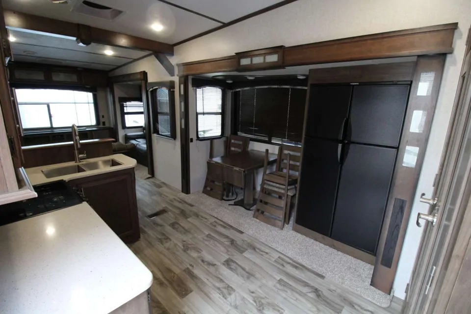 This 5th wheel has plenty of room! It can sleep 6! It has a lovely king size bed and lots of storage. The den is great! The 60 inch tv can be viewed clearly from all seating and also the kitchen. Delivery is available and preferred for a fee. Available for long or short term use