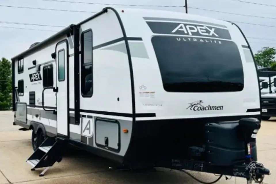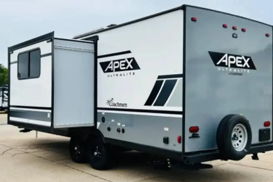 Coachmen Apex Ultra-Lite travel trailer 245BHS highlights; U-Shaped Dinette Slide Pass-Through Storage Queen Bed 32" LED TV Double-size bunks make any camping trip fun, so pack your bags and head out! When you arrive at the campground you can make a quick lunch on the outdoor camp kitchen, and unload the exterior pass-through storage. A fully-equipped kitchen indoors includes a three burner cooktop and oven, a microwave, plus a stainless steel sink with a flush-mount cover for added counter space. You will love having your own full bath on board, as well as a front bedroom with a queen bed and dual wardrobes. Lightweight living and camping is found with the Apex Ultra-Lite travel trailers by Coachmen. These eco-friendly units are made to last thanks to the Azdel composite sidewalls, the laminated aluminum floor, and the vacuum-bonded laminated crowned roof. Lippert axles and nitrogen filled radial tires make towing easier than ever, plus there is a friction hinge entrance door, a 100-watt solar panel with a 10 Amp control charger, and slam latch baggage door catches for easy unloading. Some of the interior comforts you'll fall in love with are the one-piece seamless edge countertops, the hard valances with night shades throughout, the matte black hardware, and the residential comforter. The Apex Ultra-Lite trailers also include USB ports, a digital TV antenna with cable hook-ups and Wi-Fi capability (not currently installed), and an AM/FM stereo with Bluetooth to ensure you'll never go bored on rainy camp days!