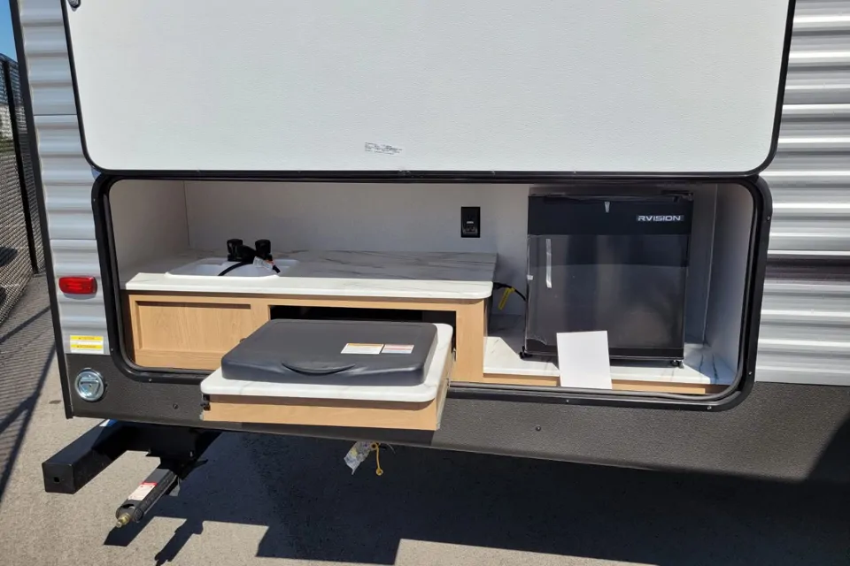 A family-friendly travel trailer with a private front bedroom, a large slide-out for a spacious living area, a U-dinette, and a rear bunk area with double bunks and a full bath. It also features an outside kitchen, a 16' power awning, and various interior comforts.