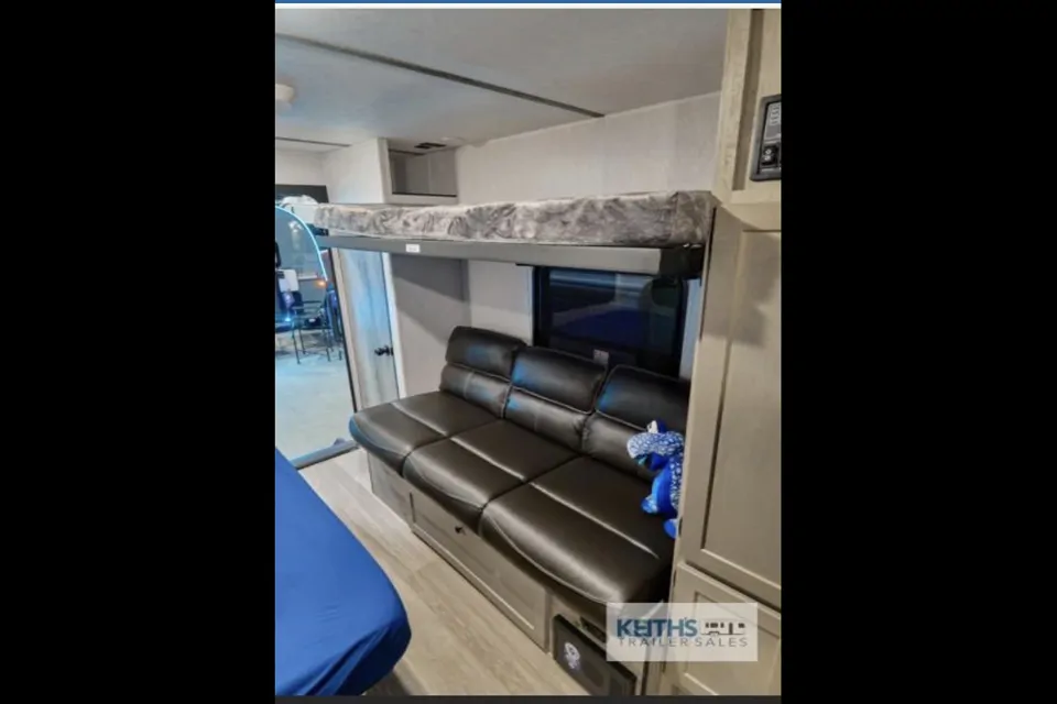 With a double bed a jack knife couch that can sleep two small kids and top twin bunk