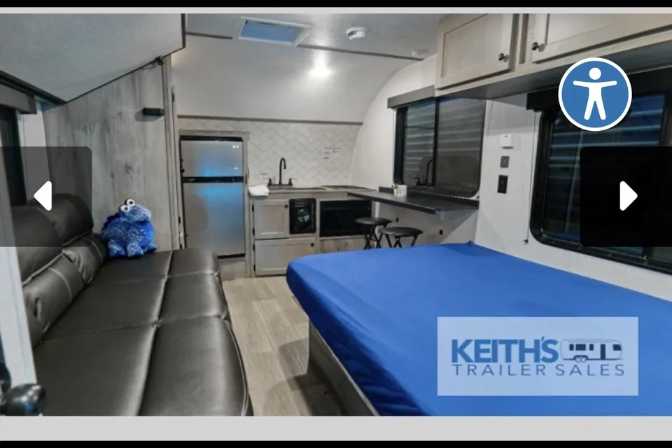 Spacious kitchen inside the camper with bar stools to sit an enjoy at the window campsite side