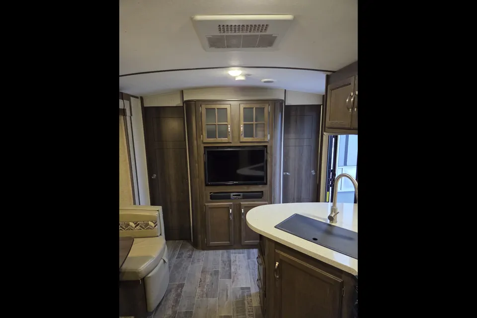 This is a really comfortable trailer with private bedroom, complete kitchen and an awesome outdoor kitchenette complete with burners & mini-fridge & attached BBQ. Great for couples or small families.