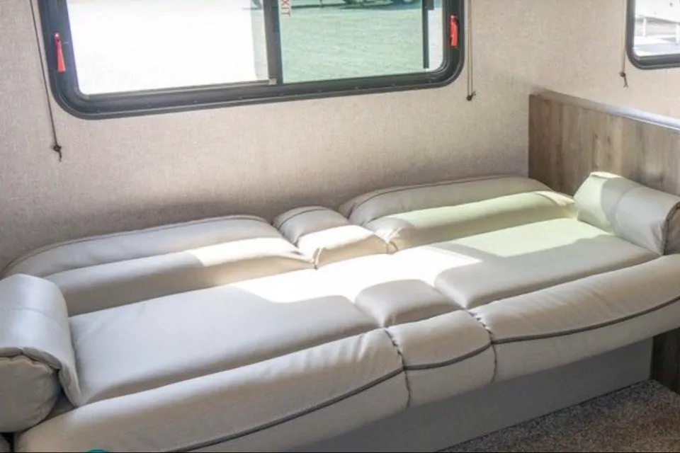 The bedroom is in front and hosts a Queen sized bed and sliding door for privacy. As well there are spacious bunk beds, and the couch folds down for additional sleeping spaces if needed.