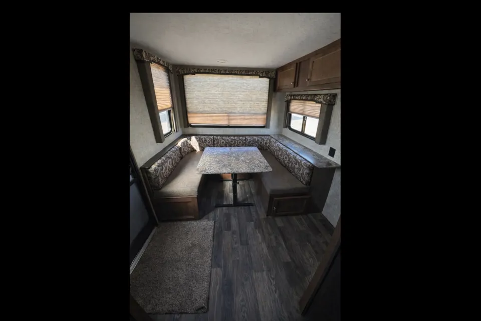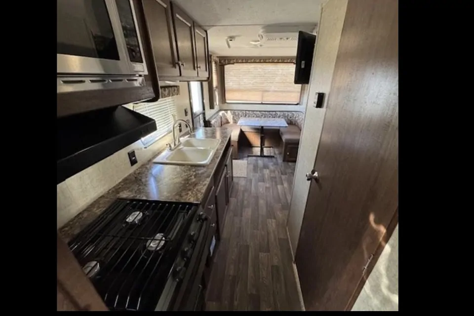 Perfect for couples or small families, our 21-foot Keystone travel trailer offers a comfortable and functional layout that’s easy to tow and simple to use. Inside you’ll find sleeping space, a kitchen with stove, fridge, and sink, a dining area, and a private bathroom with shower.
