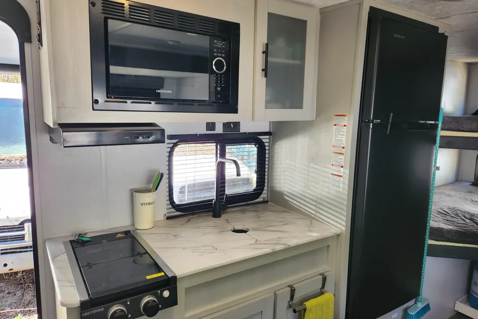 Fully Equipped Kitchen: The trailer features a fully equipped kitchen with a stove, microwave, full refrigerator, kettle, all utensils, plates, and pots/pans.