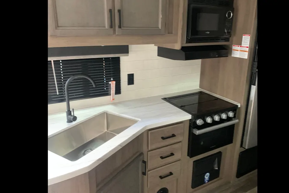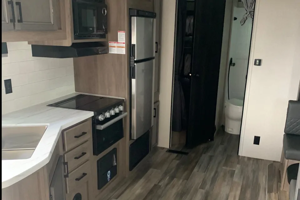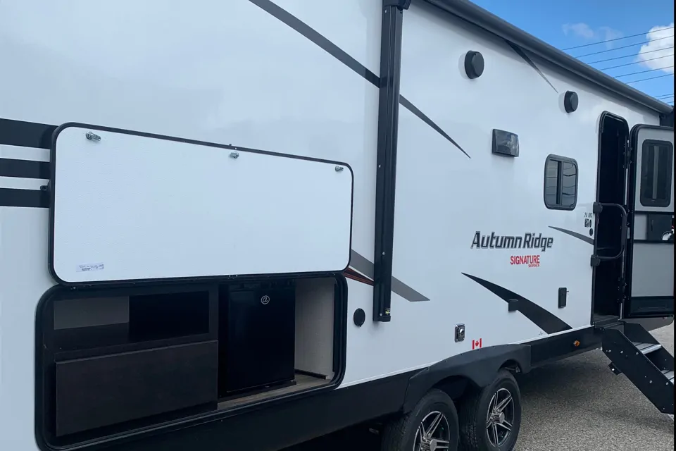 StarCraft travel travel. 26 feet length of living space. Sleeps 6-8 people comfortably with a private room with queen bed at the front. Double bunks with table and sofa that folds down. Outdoor kitchen with fridge and storage. Perfect for your camping adventures! Canopy, camping chairs, outdoor rugs.