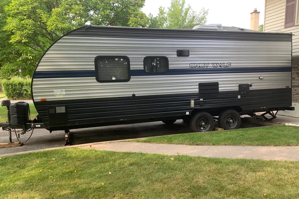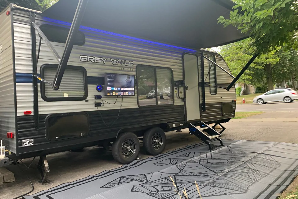 Fun travel trailer! Opening our Lion Grey Wolf second home to share with good people who will treat it like their home. Non smoking Rv. Includes a portable foldable table, outdoor mat and a clothing drying rack. It has a blue light outside on the awning to keep mosquitoes away. Also has the option of watching tv inside or outside for additional rental fee. Stereo systems on outside to play music or watch movie by the campfire, option to play just inside or have on both in and out at same time. Indoor shower and outdoor shower to rinse off from beach etc…