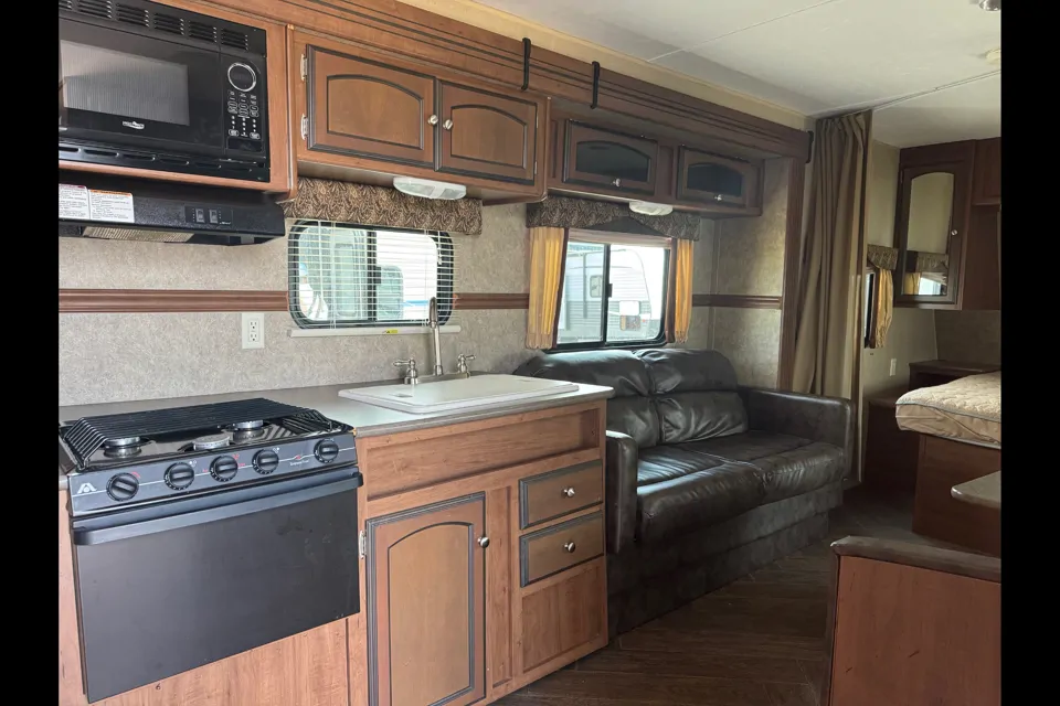 There is a ton of storage available for all your supplies. The cupboards and drawers are stocked with all the supplies you need for cooking and cleaning, including a toaster and coffee maker. We will supply dish towels but for sanitary reasons we ask you to bring pillows, linens and towels to ensure the safest environment for your camping experience.
