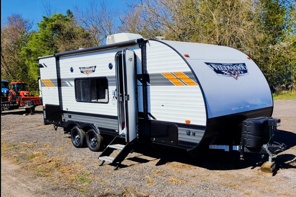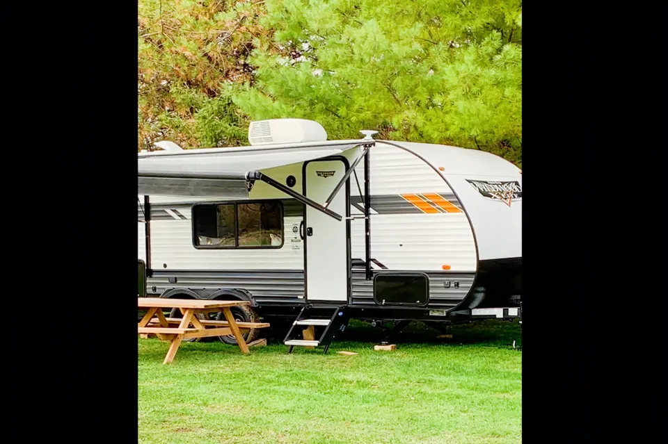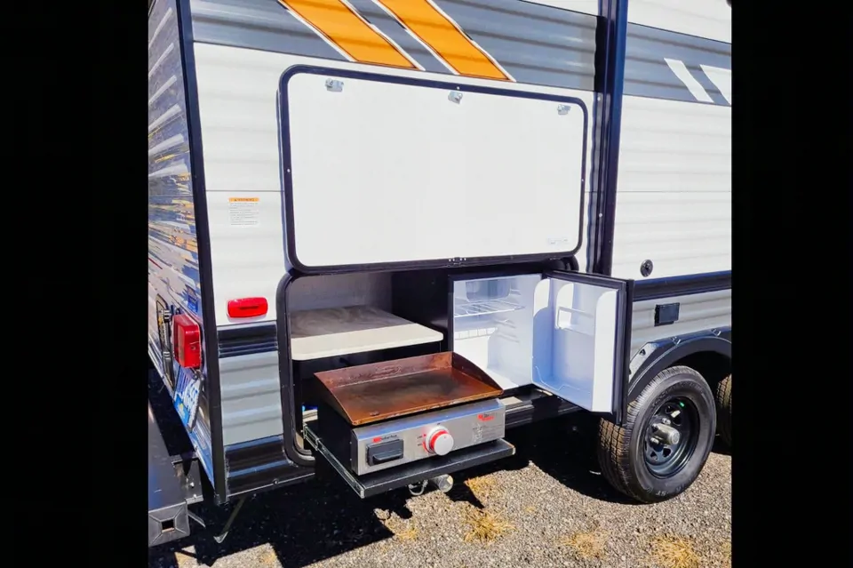 Clean, great layout for a family or couple. 19ft in floor space inside, with power awning and jacks for an easy set up. Fully stocked kitchen with everything you need, including coffee maker, kettle, sizable fridge, oven, stove & microwave. PLUS outdoor cooktop grill with mini fridge outside. All you need is food, drinks, clothes and linens.