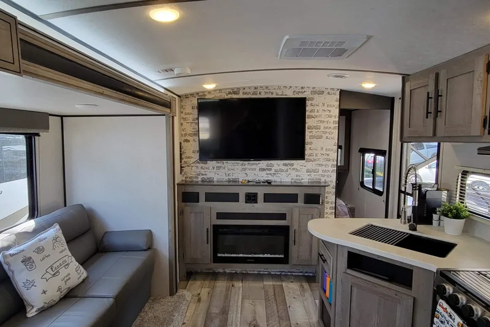 This RV comes with everything you need: Cookware, small appliances, linens, pillows, camping chairs, beach chairs, beach umbrella, outdoor kitchen, BBQ, tv, camping mat, outdoor shower, wagon, etc. Very easy to use all the features inside and outside the trailer.