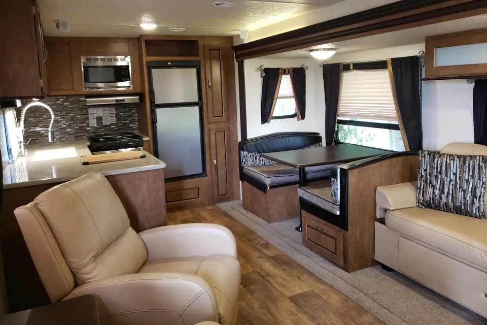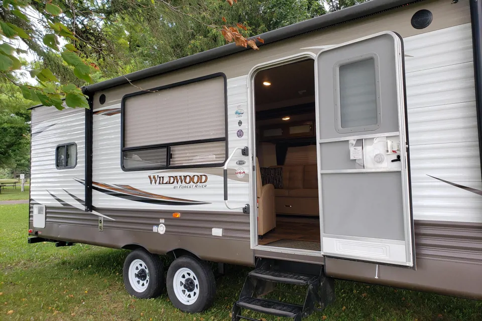 Its a beautiful 30ft travel trailer that fits into any campground spot with all the comforts of home and is easy to set up in minutes! Very roomy and so cozy, sleeps 4 or 5 and comes with Pet-friendly!