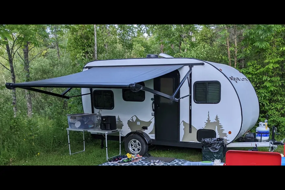 Inside you will find a 2 burner stove, sink, wet shower, 3.3cu ft 2-way fridge, fantastic fans, furnace, USB ports and an AC (only operates when the trailer is connected to power). The electric awning provides great shade!