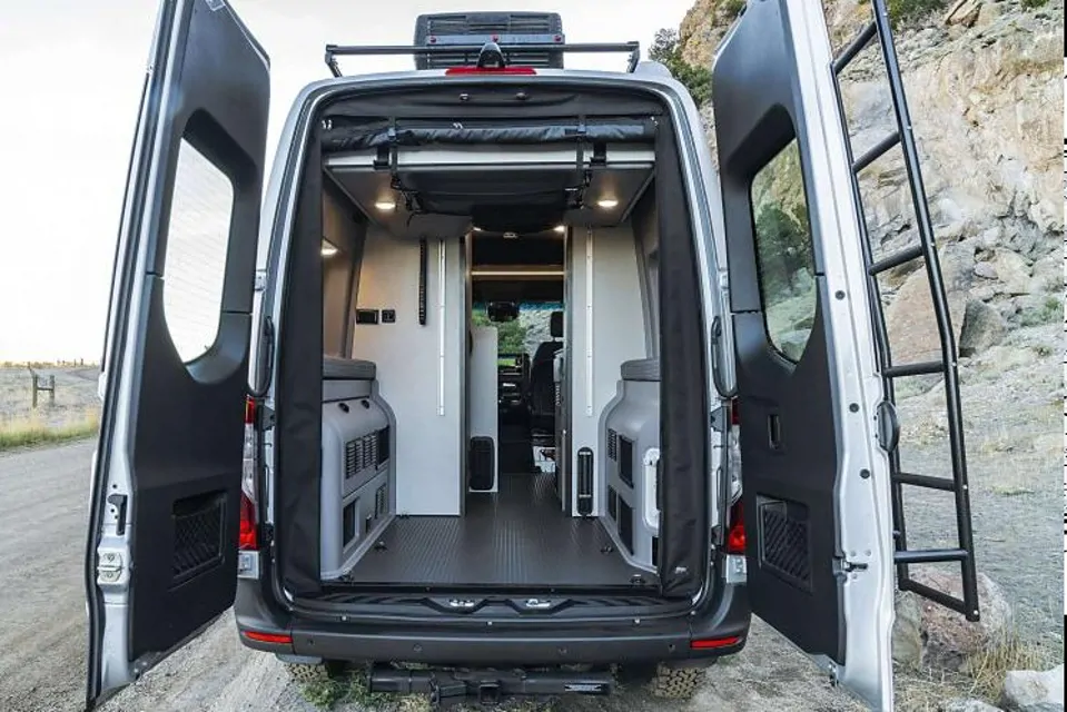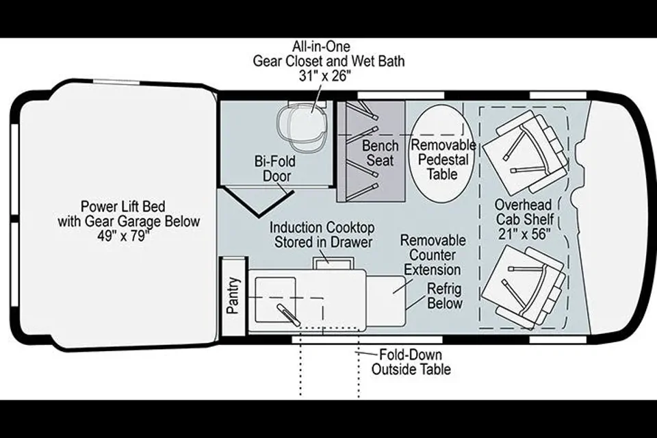 Power Lift bed, which can be stored in an upright position during travel; the space doubles as your "gear garage" wher e you can use it to store bikes, skis, camping gear, suitcase, etc.