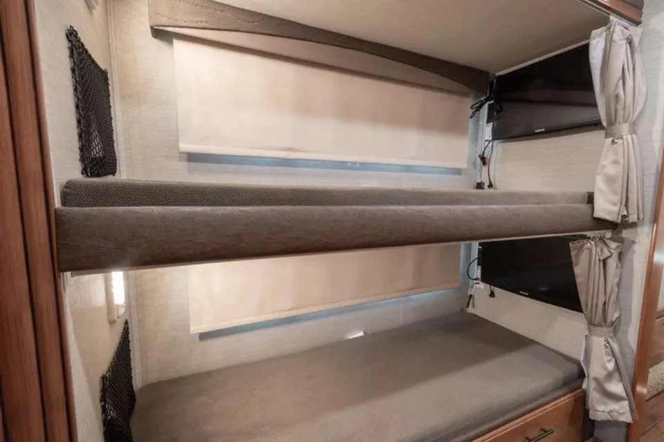 Easy to drive RV with 2 massive slide outs giving you tons of room. There is a queen bed above the cab, a sofa couch, the dinette converts into a bed, and the master bedroom has a queen. 2 single bunk beds give you extra sleeping space.