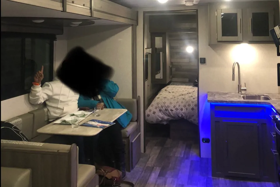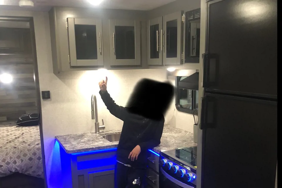 Beautiful new camping trailer. very clean. King-size bed with a door for privacy. beautiful kitchen area for cooking your morning breakfast and looking through the window. enjoy the electric fireplace on those rainy nights cuddling with loved ones or relaxing while reading a book. plenty of room for a weekend escape or week-long stay of Glamping.