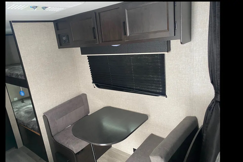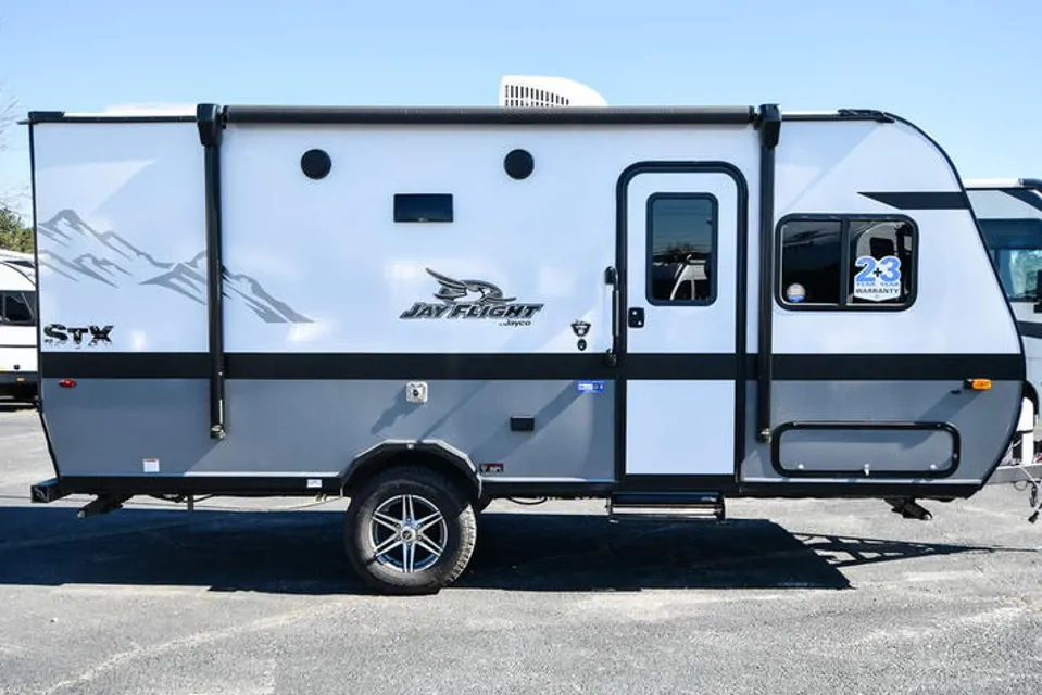 Fun and relaxation awaits you in a new 2022 Jay Flight 17 ft bunkhouse (174BH model). This is the upgraded STX off road model. This family and pet friendly home away from home is feature-filled and includes everything you need for the perfect getaway vacation. The front queen bed, rear bunk beds and fold down dinette can comfortably sleep up to 5. This trailer is loaded with storage, including large compartment under the queen bed, under the lower bunk, overhead cabinets, cupboards and more!