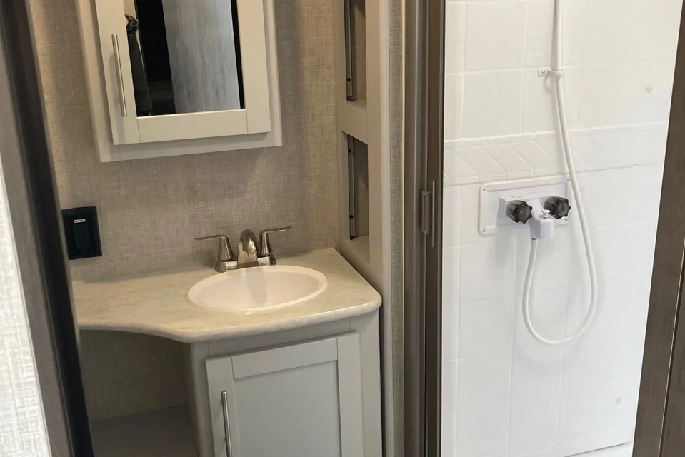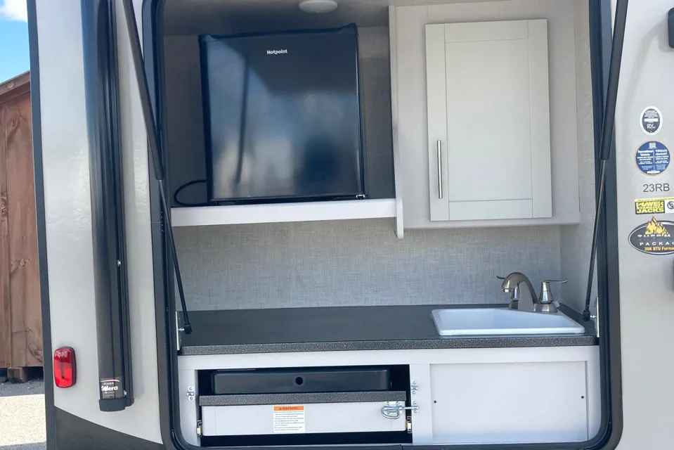 Compact 23 ft trailer but not on comfort. Bought in 2021 new. Queen size bed and two lazy boy chairs that fold down almost flat. Includes linens, towels, cutlery, dishes, coffee maker and cooking utensils. This model includes an outdoor kitchen that has propane burners, bar fridge, and sink. This is a bring only your food and clothes option. Board games and dvds as well as a propane barbecue already packed and if you tell us a bit about yourself you never know what will be in the welcome basket.