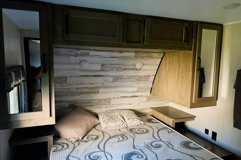 Well kept, great for big families, 2 sets of bunk beds in the rear with a master queen bed in the front both have doors for privacy. Lots of storage. Mini fridge on the outside.
