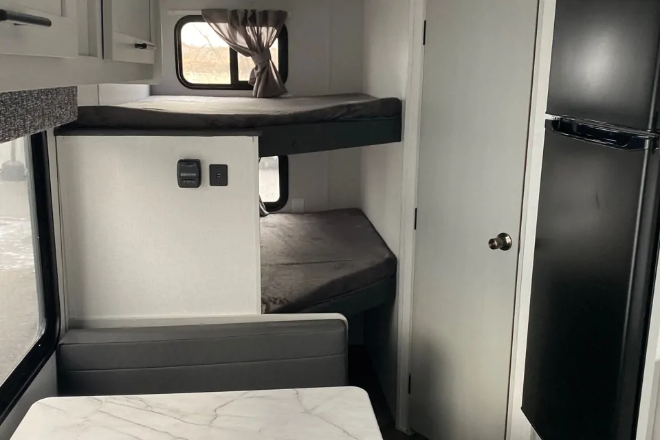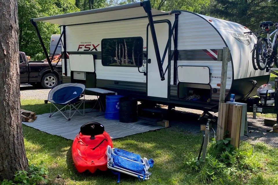 This trailer is bright and clean and perfect for a family with small kids. The double size bunk beds can fit two small kids or one big teenager. The dinette is cozy and can be converted to a small bed. The refrigerator is huge, you can store a weeks worth of food. The outdoor fridge is handy for extras or drinks. There is lots of storage room inside and out. Trailer comes with foam toppers on the mattresses for added comfort. Bike rack for two bikes. Three camping chairs, BBQ, full kitchen accessories, coffee maker, toaster, etc included. Electrical site required for booking unless you have a generator.