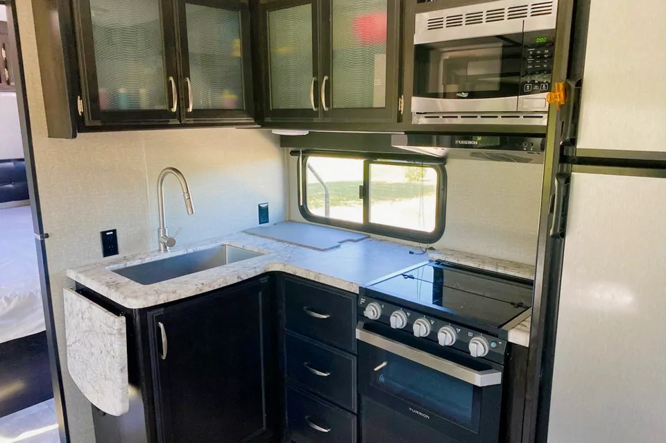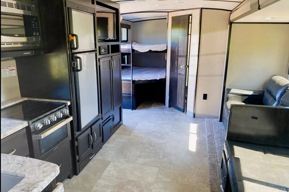 This trailer has all you need; A lot of space, a lot of sleeping room, and a lot of storage space. This all adds up to a lot of fun. Double bunks, pull out couch and dinette that turns into a double bed as well. All dishes, coffee maker, & kettle included. BBQ and linens are an added fee. Hitch with sway control available with rental. No pets please.