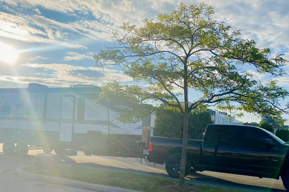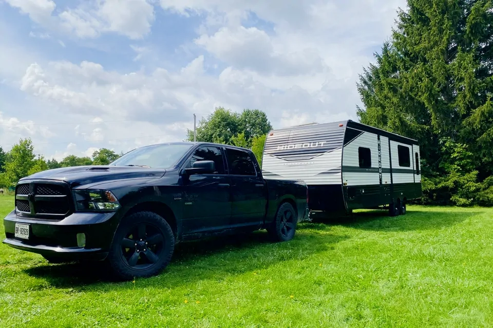 Modern trailer with double bed and double pull out. Pull out couch transitions into dining table. 2 lazy boy recliners and tv set.