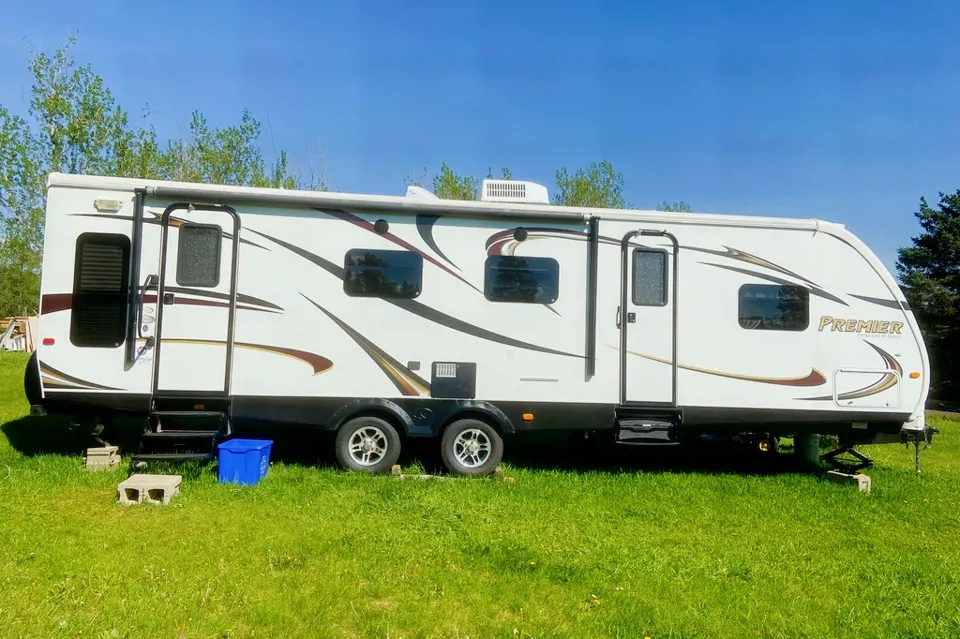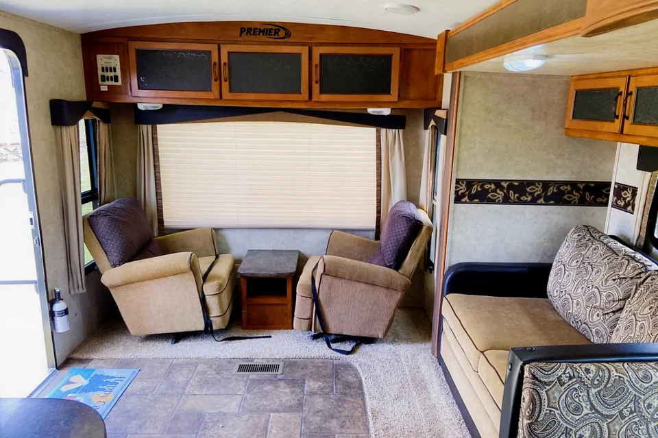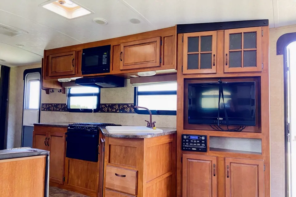 This 30ft Couples trailer has all the convenience of home. Good counterspace, captains chairs. Shower has enough room for taller people. Basic Kitchen supplies.Heat, A/C, microwave, stove, oven, tv,dvd,hdmi compatibility,radio, outdoor speakers, awning. Pet Friendly.