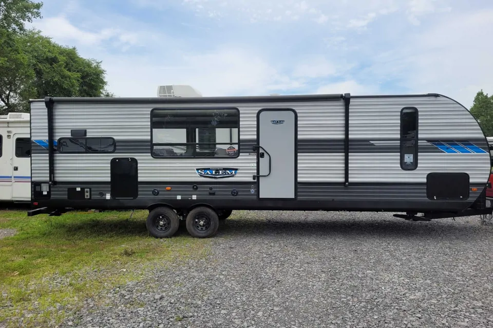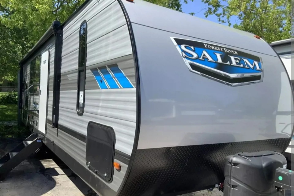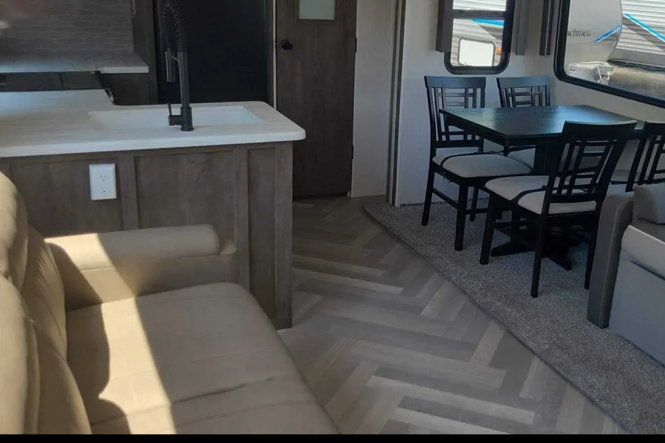 Beautiful modern 2022 travel trailer. Perfect for couples and small families. Open, airy, and very bright interior with 4 panoramic windows . Includes a private bedroom with solar blinds, storage, a full-size fridge, and a large dining table with four chairs! dishes, utensils, pots, and pans are provided. A beautiful home away from home! Everything you need to make wonderful memories.