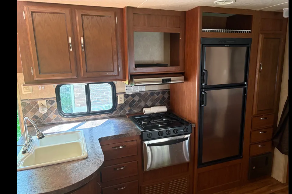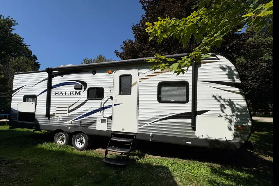 We have a 27 ft travel trailer with 1 slide, that is perfect for a family getaway. It has double bunks in the back, queen bed in the front, couch and dinette also pull out, outdoor shower, 30amp with fridge, freezer, 4 burner stove and oven. Enjoy a/c and furnace for comfort needs.