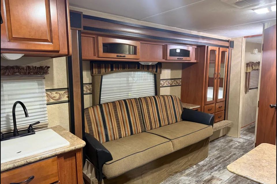 This spacious, family-friendly trailer offers all the comforts you need for a relaxing getaway, complete with a roomy interior, full kitchen, and a private bedroom with its own exterior entry. The futon-style sofa and dinette both convert into beds, making it perfect for couples or families looking to camp without compromising on comfort.
