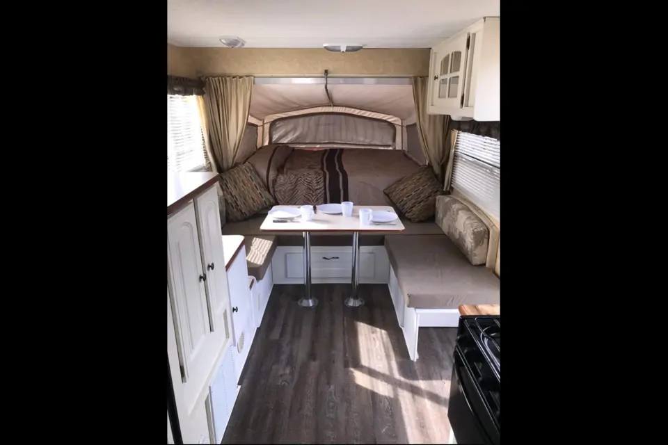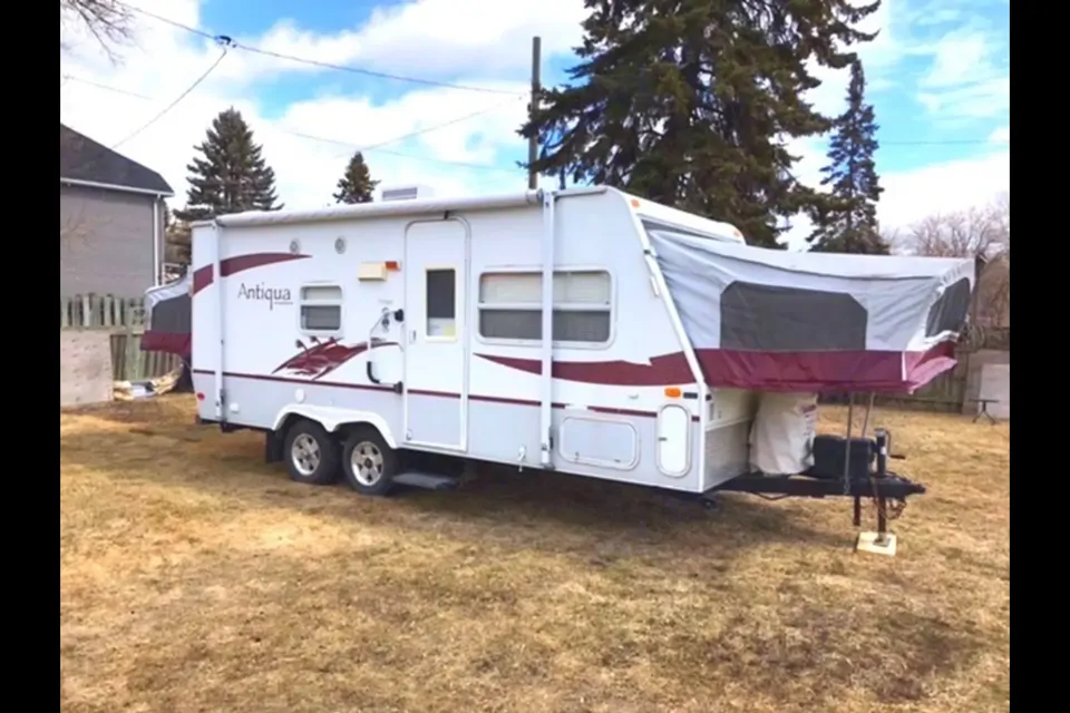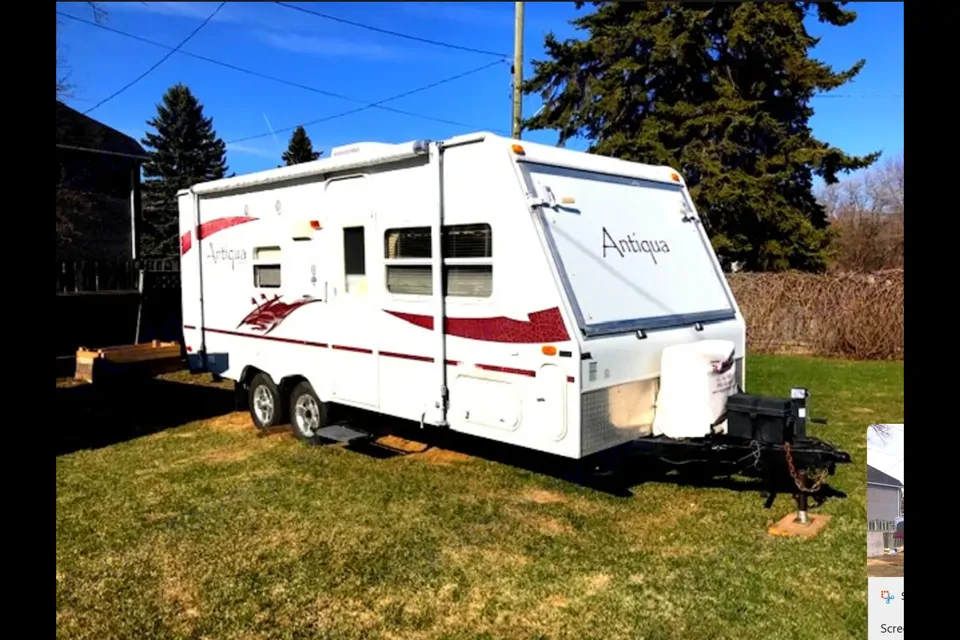 Lightweight Hybrid trailer Fully outfitted, pots, pans, toaster, cutlery, glassware, cups, casserole dishes, etc. standard sized refrigerator and freezer, microwave, gas stove and oven, AM/FM/CD stereo, awning, outside shower. It has a bathroom with a stand-up shower, sink, and toilet. Also a TV/DVD player with a mix of DVDs to watch. Sleeps six and is a very clean, bright, and well maintained. Comes with a small portable BBQ and a five-pound propane tank, water hose, extension cord. Cleaning supplies will be available for use as we would like our unit to return in the same clean condition as it left or if you don't feel like this is a chore for you, cleaning is available starting at $60 and up depending on the returned condition.