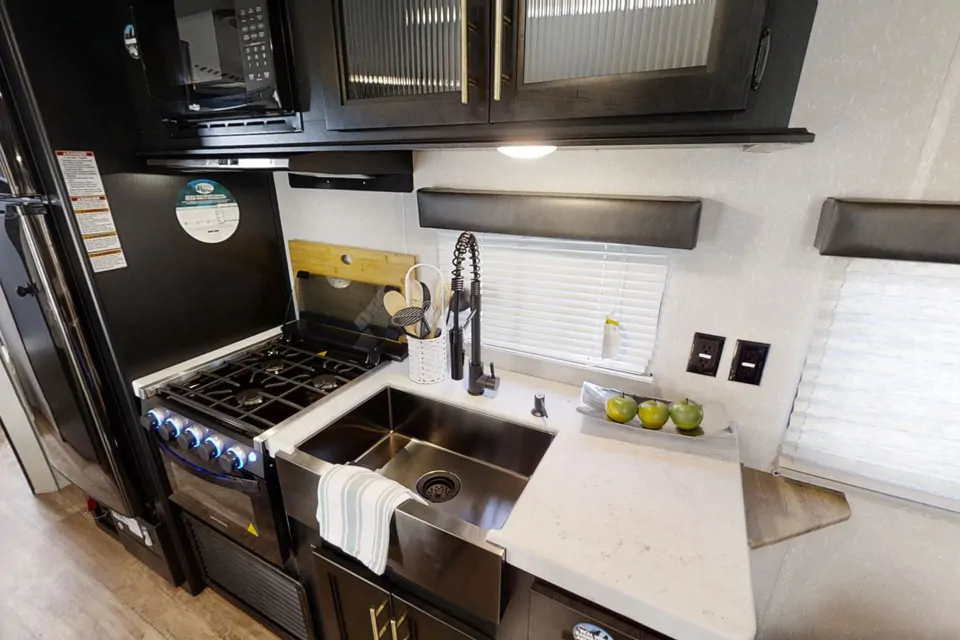 Gorgeous brand new 2022! Private Queen bedroom w/curtain, double over double bunks. Great layout for family or couples! Lots of cupboards for storage of clothes, food, etc. Large fridge with freezer, 3 burner propane stove, oven, built-in stainless steel microwave, stainless steel farm style sink, good sized bathroom with tub/shower, vanity, and medicine cabinet. Built-in radio with indoor and outdoor speakers. AC and heat are controlled by a digital programmable thermostat.