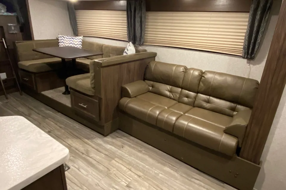 Dinette folds down for an additional 2 campers to sleep. Linens, broom & dustpan, RV Toilet paper, Toaster, cutlery & Dishes included